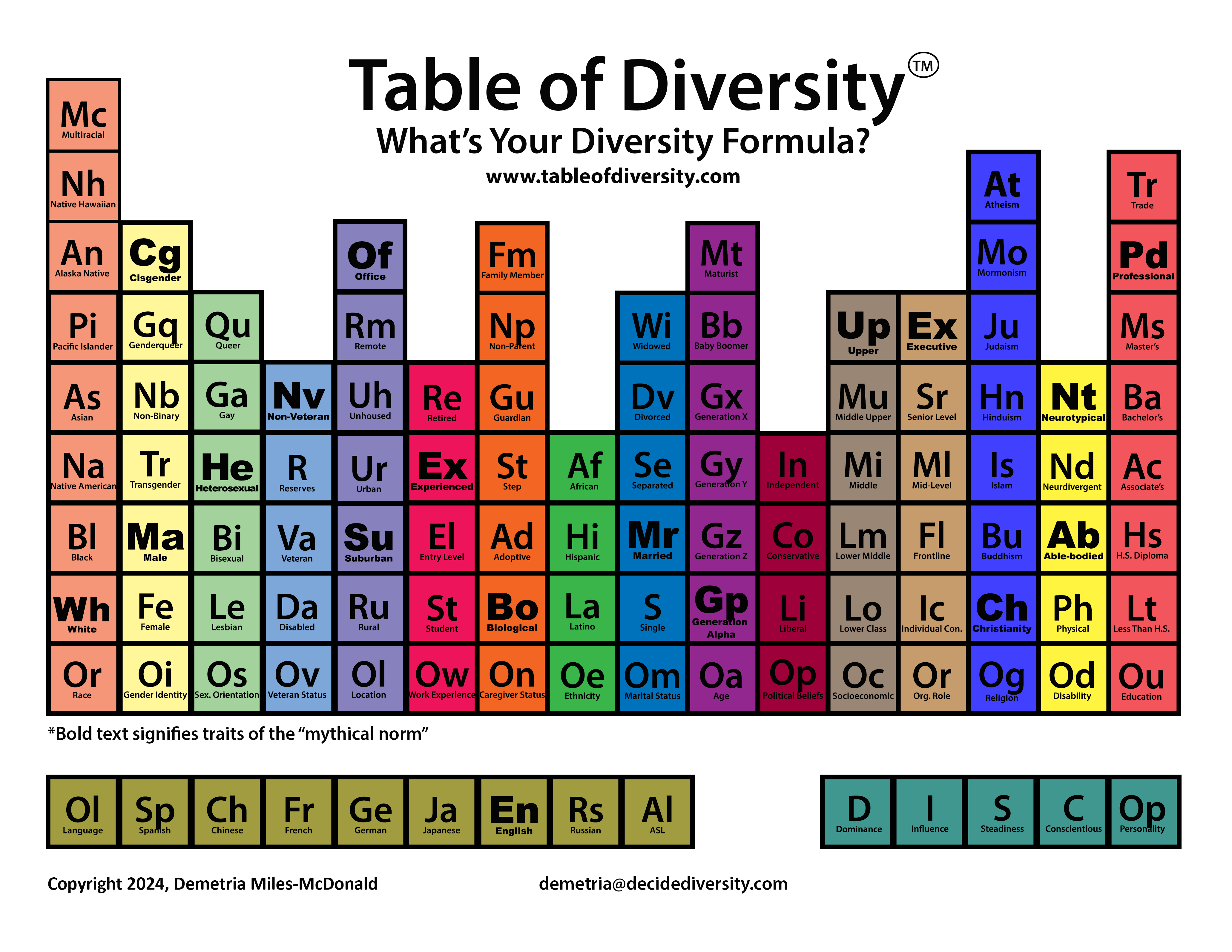 The Table of Diversity is my modern take on the periodic table of elements. It serves as a framework for understanding the diverse identities and experiences that shape our world. I believe that just as the periodic table of elements organized the complexities of matter, the Table of Diversity helps organizations and individuals navigate the intricate landscape of human connection.